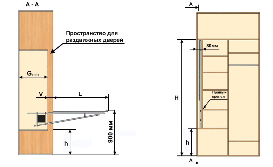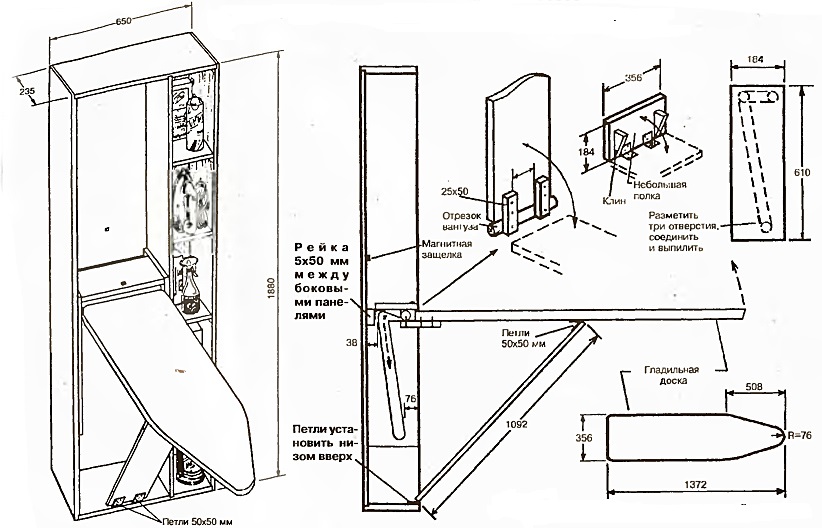 The dimensions of the board can be very diverse, from miniature, where small pieces of clothing will be placed, to a full one-and-a-half surface, on which you can easily iron an evening dress or raincoat. The fastener will be different for each of the cases: a more powerful design requires durable and reliable systems, a smaller one allows you to use dowels and screws of suitable length that are screwed into the back wall of the cabinet, if it is strong enough, or into the wall.