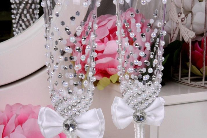 If the celebration takes place at home, then you can give magic with the help of LED ribbons or garlands, and glasses of the newly-weds decorate with artificial pearls.