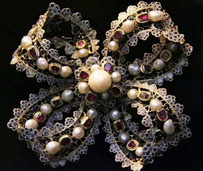 - pearl brooches inlaid with precious stones.