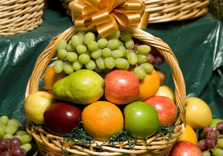 - A fruit basket can be a pleasant and bright gift. It must have apples, oranges, lemons and grapefruits. The basket handle is tied with a satin ribbon in yellow or orange. Chocolate figurines can also be put in the basket. Such a gift will be remembered for a long time by the spouses.
