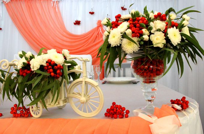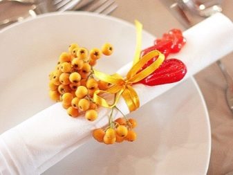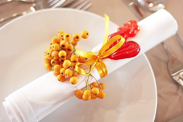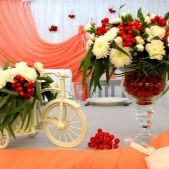 A little more space of fantasy will give the name "ashberry wedding." It is logical that white, red and green shades will rule the ball. The main color is better to choose white, because the remaining two with heavy use will tire. Autumn wedding can be decorated with natural rowan clusters. They can be the main bouquet on the table or be placed in the napkin ring, in the plates or next to them for each guest.