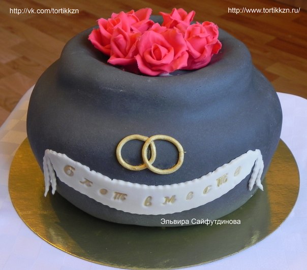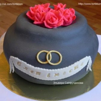 Cake can be made in the form of a pig-iron cup with a joking inscription, which is given for perfect family life. As a rule, such a gift is prepared by guests. Even if a small company of relatives gathers at the table, take care of themed interior design. You can opt for a combination of white and golden or warm yellow, light brown. They will symbolize cast iron.