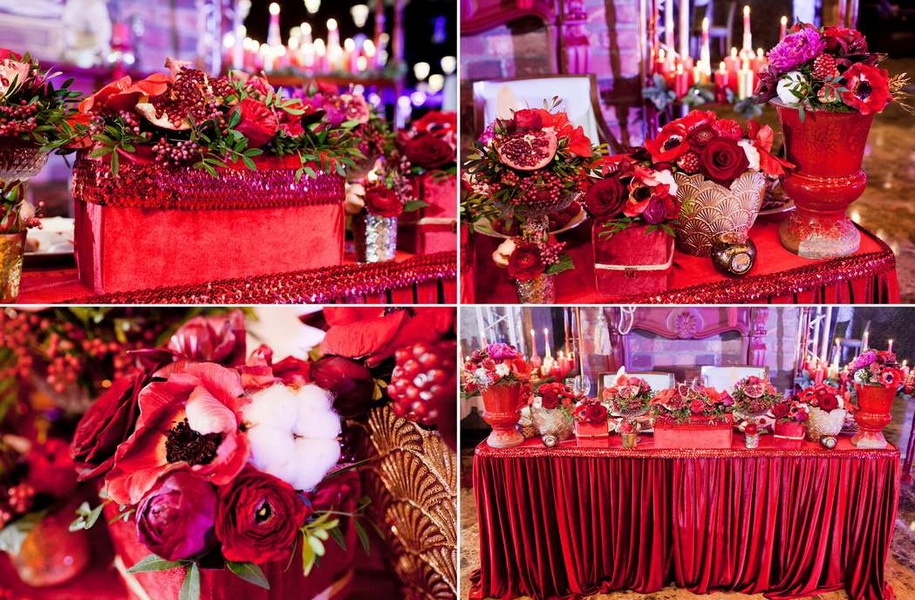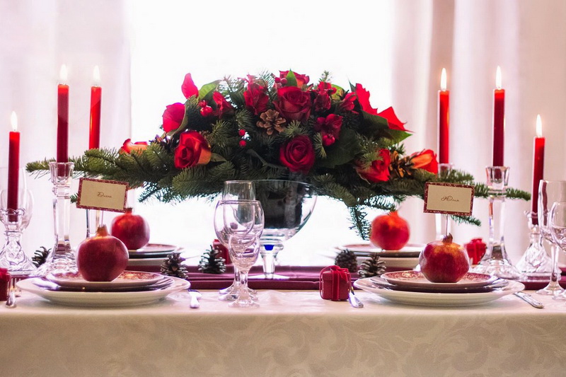 Red color can be the decor of the hall where the celebration takes place. Tablecloths luxurious wine-colored, balloons filled with helium bronze and red flowers.Vases with miniature bouquets and a composition of pomegranates. Creatively make photo collages on the walls, bringing together the happiest moments of life together.