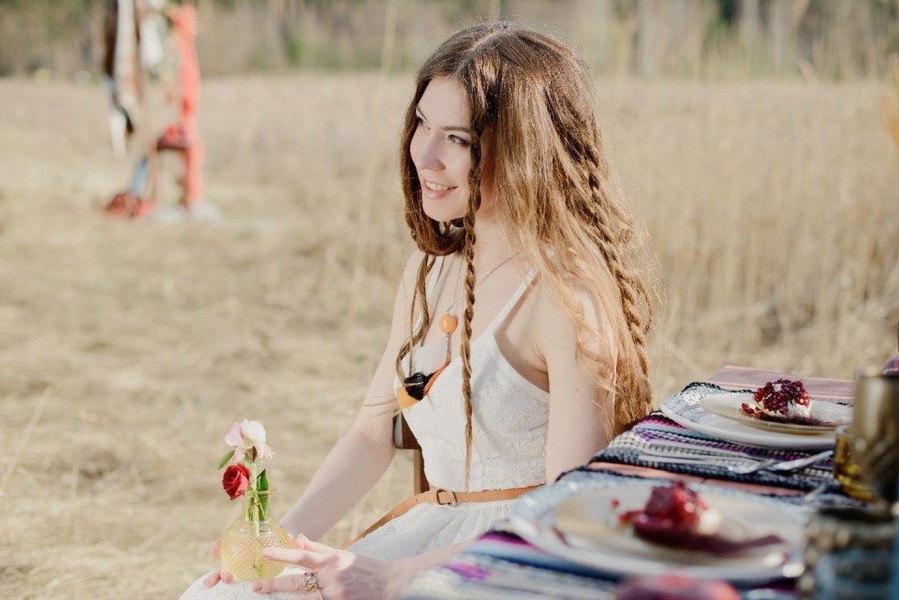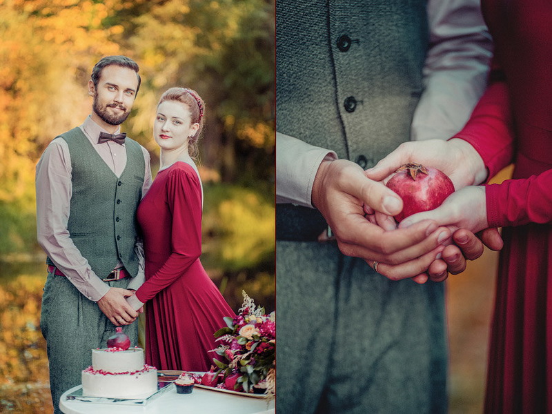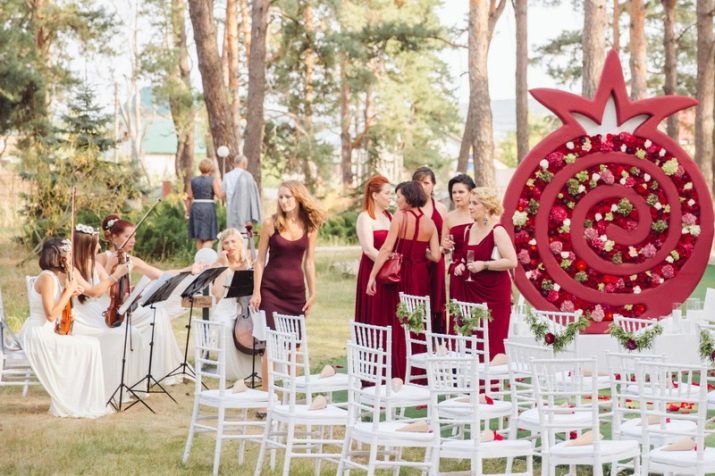 Another celebration option: a retreat with a tent and a symbolic burgundy veil on the head of the spouse. Exchange of pomegranate rings and picnic on the air with light alcoholic drinks and original snacks. It does not require long tables with tents and large cash costs. You can do everything moderately modest, but as the soul commands. To remind ourselves and everyone around, over the years, love is only more expensive and cleaner, like a pomegranate stone!