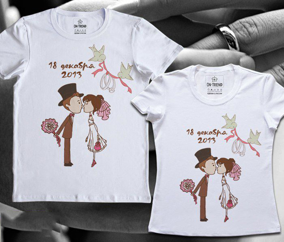 You can be more original and present both spouses with T-shirts with individual text. Surely the young will be pleased with the pair of products made according to your own layouts. Here in the course can go family photos, declarations of love or some phrases that have meaning only for spouses.
