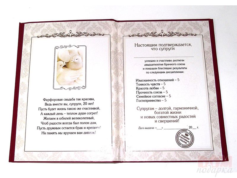 An excellent reason to fill crystal glasses with a sparkling drink is the 15th anniversary of living together, called the crystal wedding. Of course, you should not give crystal shoes, but sets of Bohemian glass and this material will be very useful. Do not forget that in the USSR the presence of crystal in the house was considered a sign of wealth, so the older generation has a special attitude towards it. Round date in 20 years of family life is popularly called porcelain. Following this symbolism, gifts should be appropriate. A tea set or a set of plates with a list will remind the spouses for a long time about beautiful moments spent with family and loved ones.