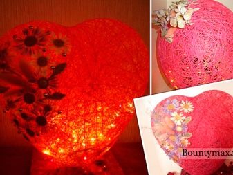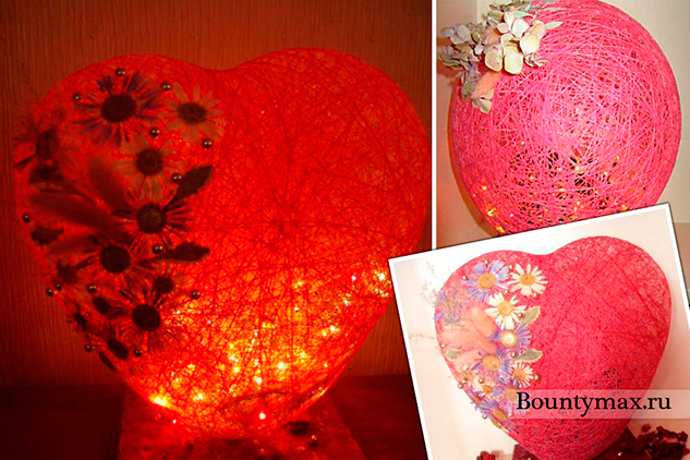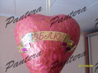 The heart is painted in pink or red color, a gift, candies and chocolate are laid inside. The hole is covered with paper, and the heart itself should be tied with white tape and put in a conspicuous place with flowers.
