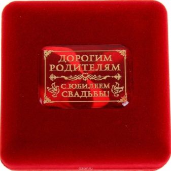 It is quite possible to give such pleasant things as souvenirs, statues, vases, etc. The main thing is that they are associated with a solemn event or at least be red, burgundy or scarlet. Try to give pair souvenirs. Such gifts will help to bring togetherness and comfort to the family atmosphere.