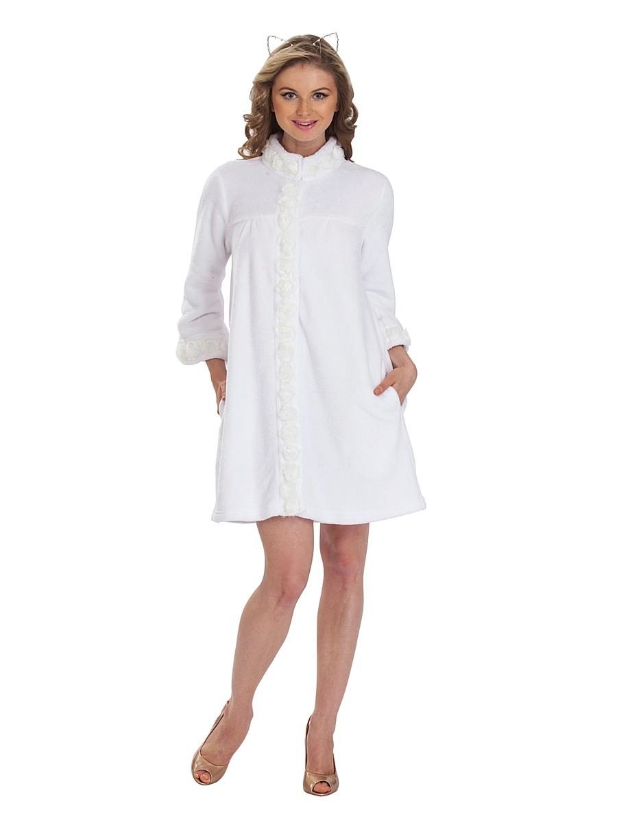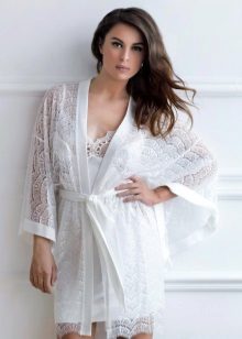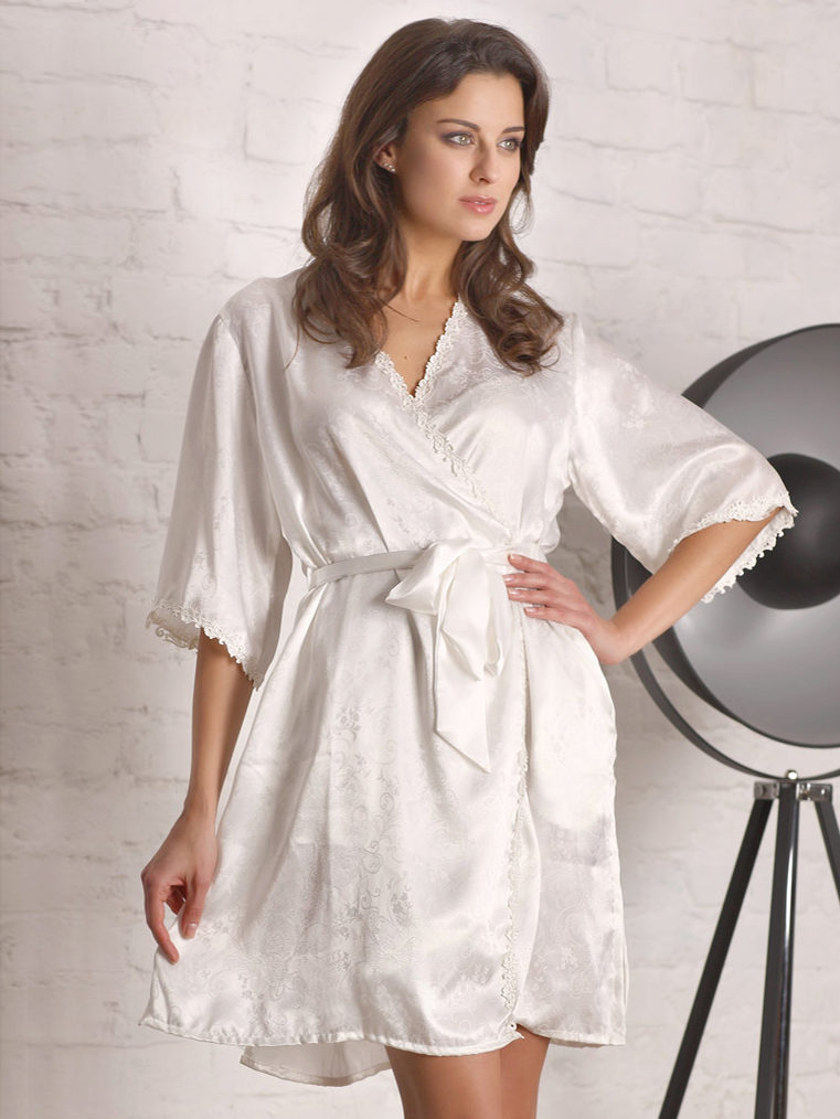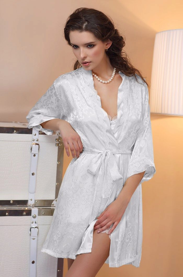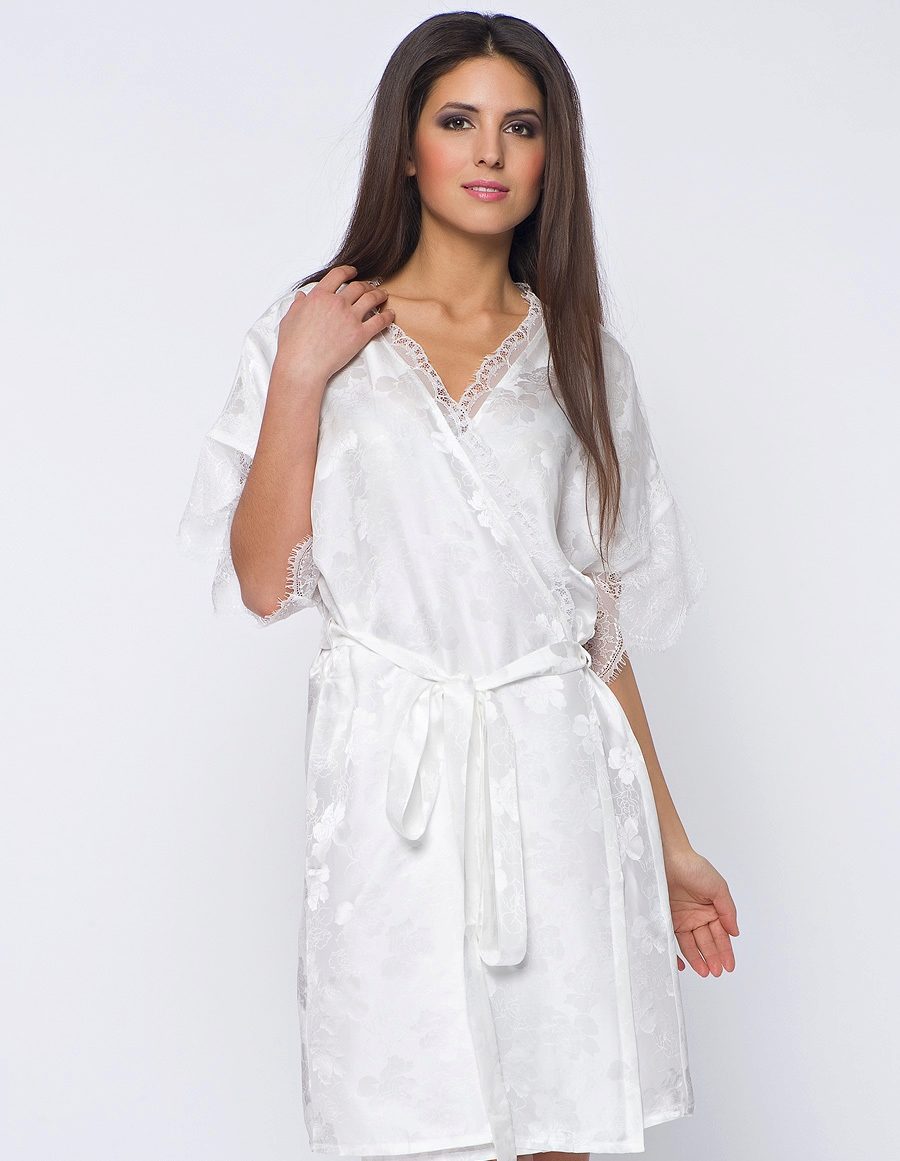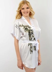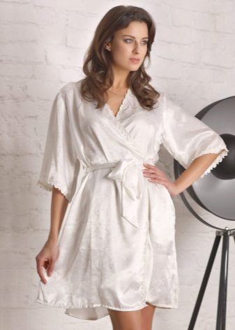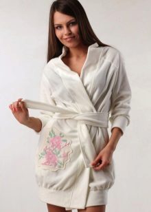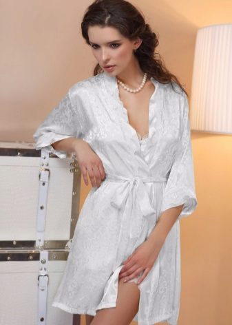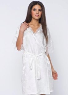 - A special attention is given to a snow-white mini-length robe. He emphasizes the beauty of the legs and femininity of the silhouette. Depending on the fabric short dressing gown is suitable for both summer and winter. Of course, for the embodiment of a seductive bow snow-white short robe is an excellent choice.