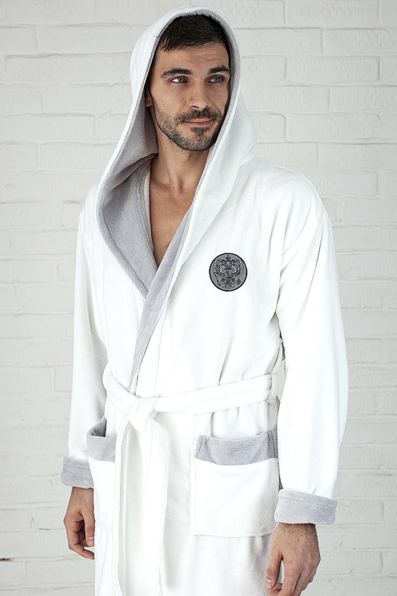 One more worthy variant of a white dressing gown which differs in original relief pattern on fabric. This model has a short length, a hood and long sleeves. The dressing gown with a smell on a belt differs in convenience when dressing. The snow-white material is 70% viscose and 30% polyester.