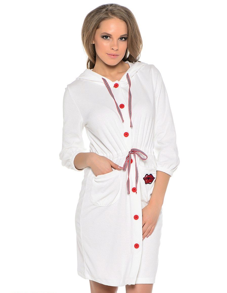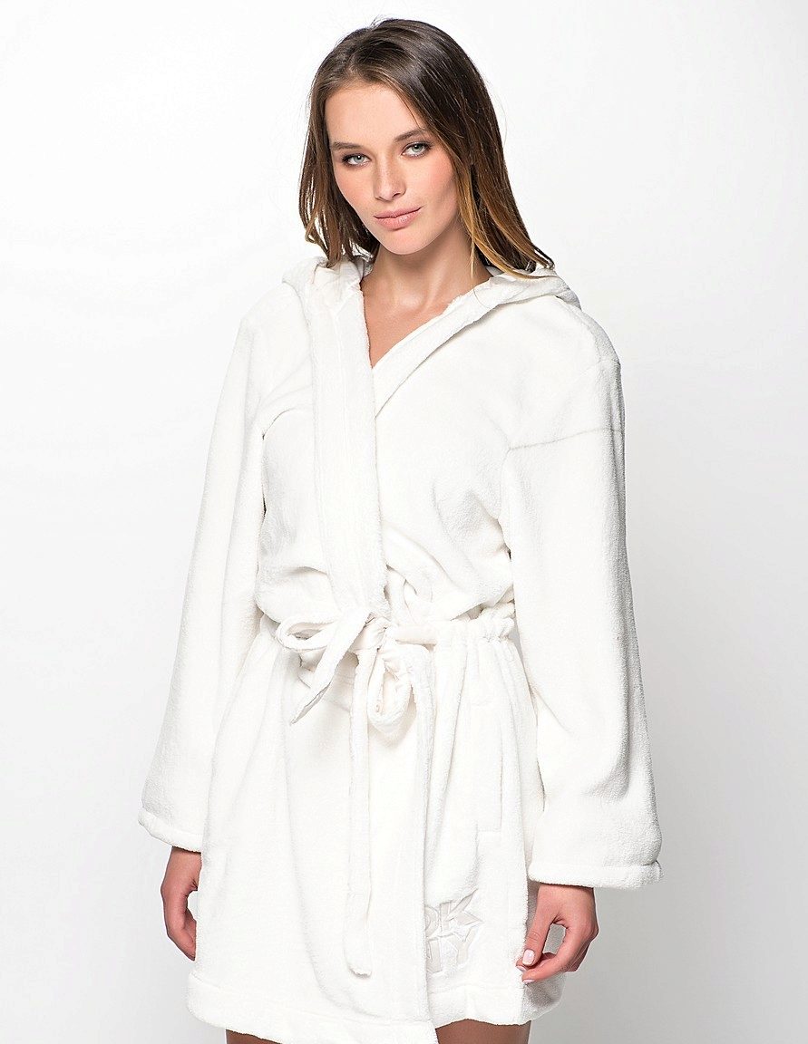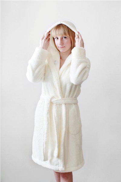 Stylish snow-white dressing gown of short length is ideal for slender beauties. It is made of 100% polyester and is suitable for any time of the year. The model has long sleeves, which are decorated with cuffs. Dressing gown with a smell and on a belt differs in convenience and comfort. This model also has a hood, which performs not only practical, but also an aesthetic function.