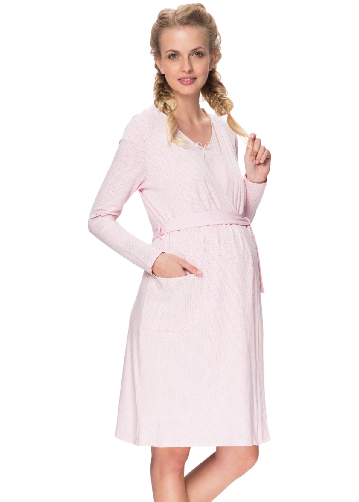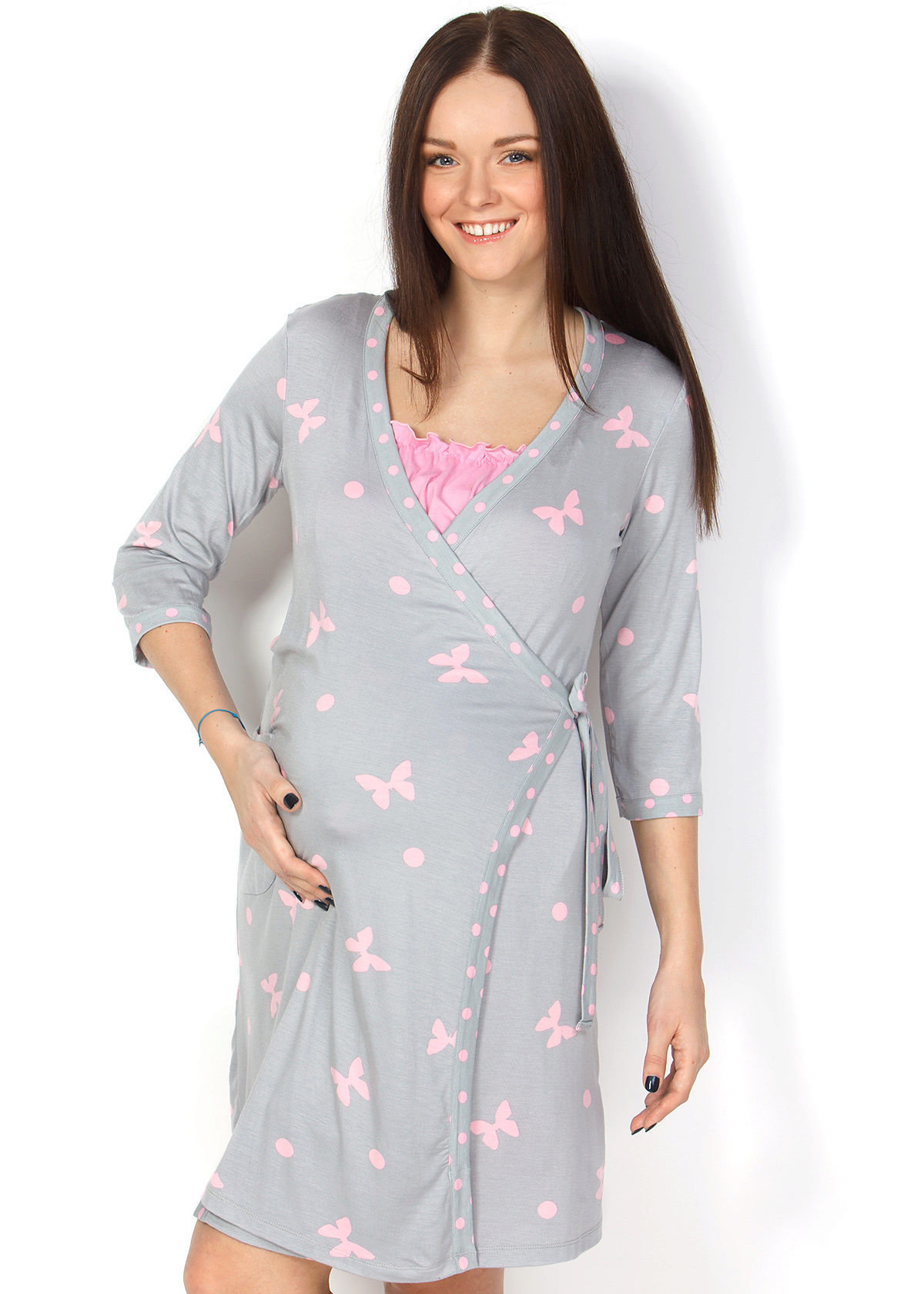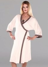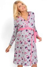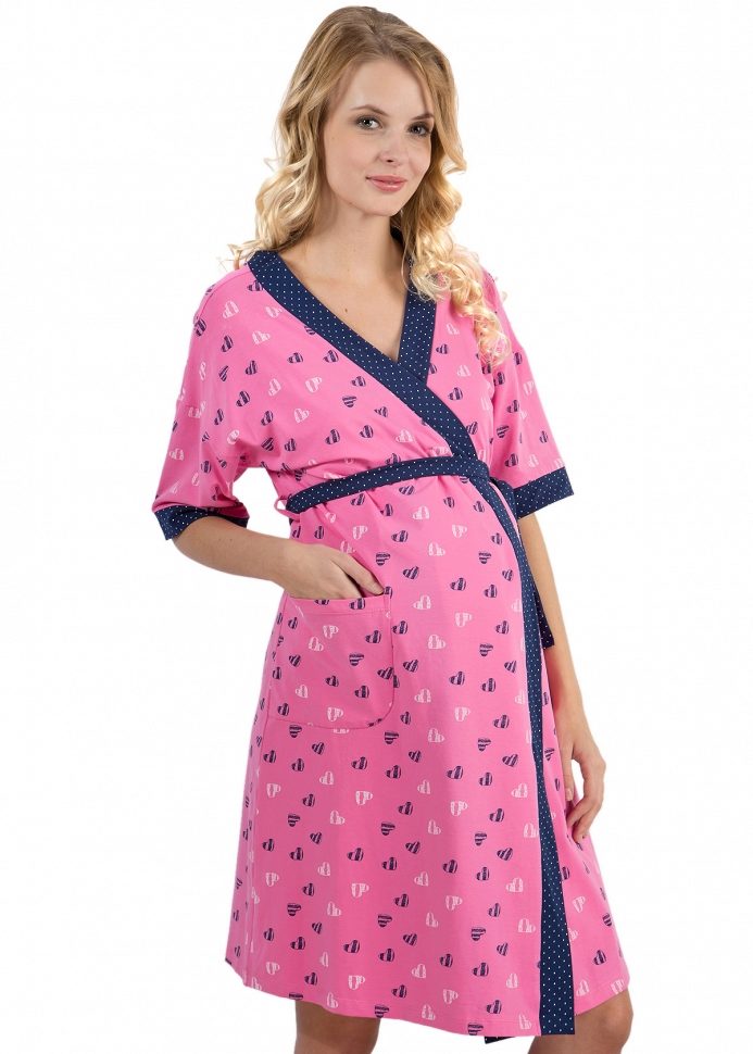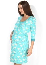 One of the most suitable styles of a dressing gown for a maternity hospital is a dressing gown with a smell on a belt or on ties, a woman can wear it in the prenatal period and after childbirth. A zip-up gown is also convenient so that when feeding you do not have to spend time and effort on unbuttoning buttons. The length of the product, you can choose any, but the most popular, as a rule, uses the average length (just below the knee).
