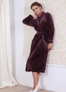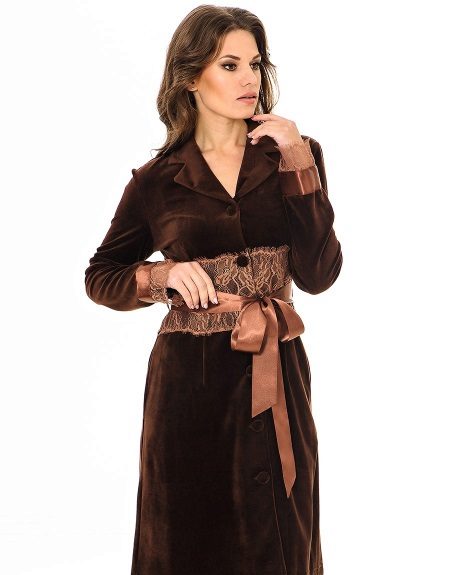 - Strict chocolate - the language does not turn to call a cozy velor robe of medium length with an English collar, an incredibly beautiful lace trim on the waistline and sleeves, and a satin ribbon belt.