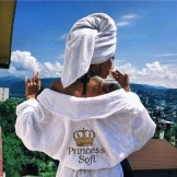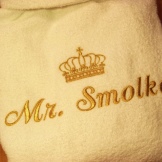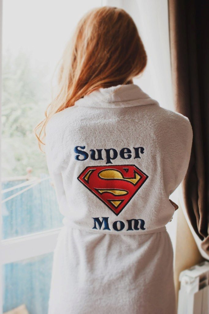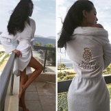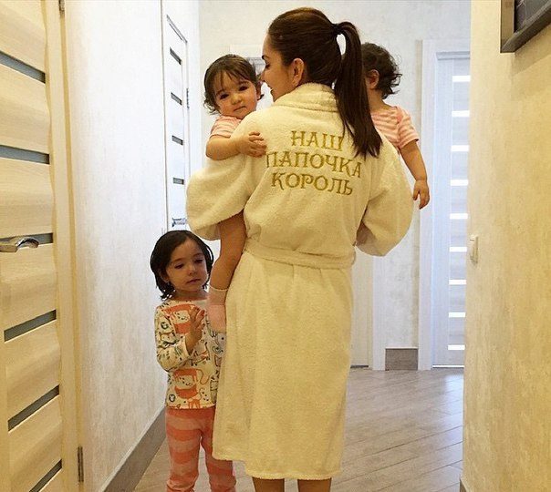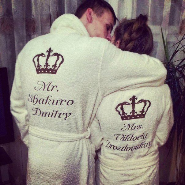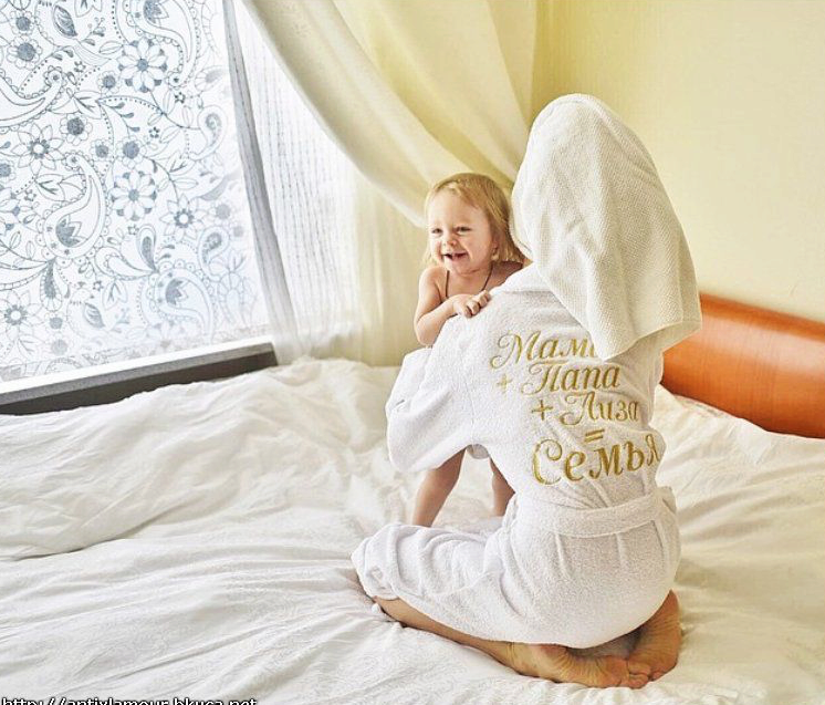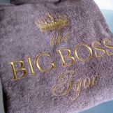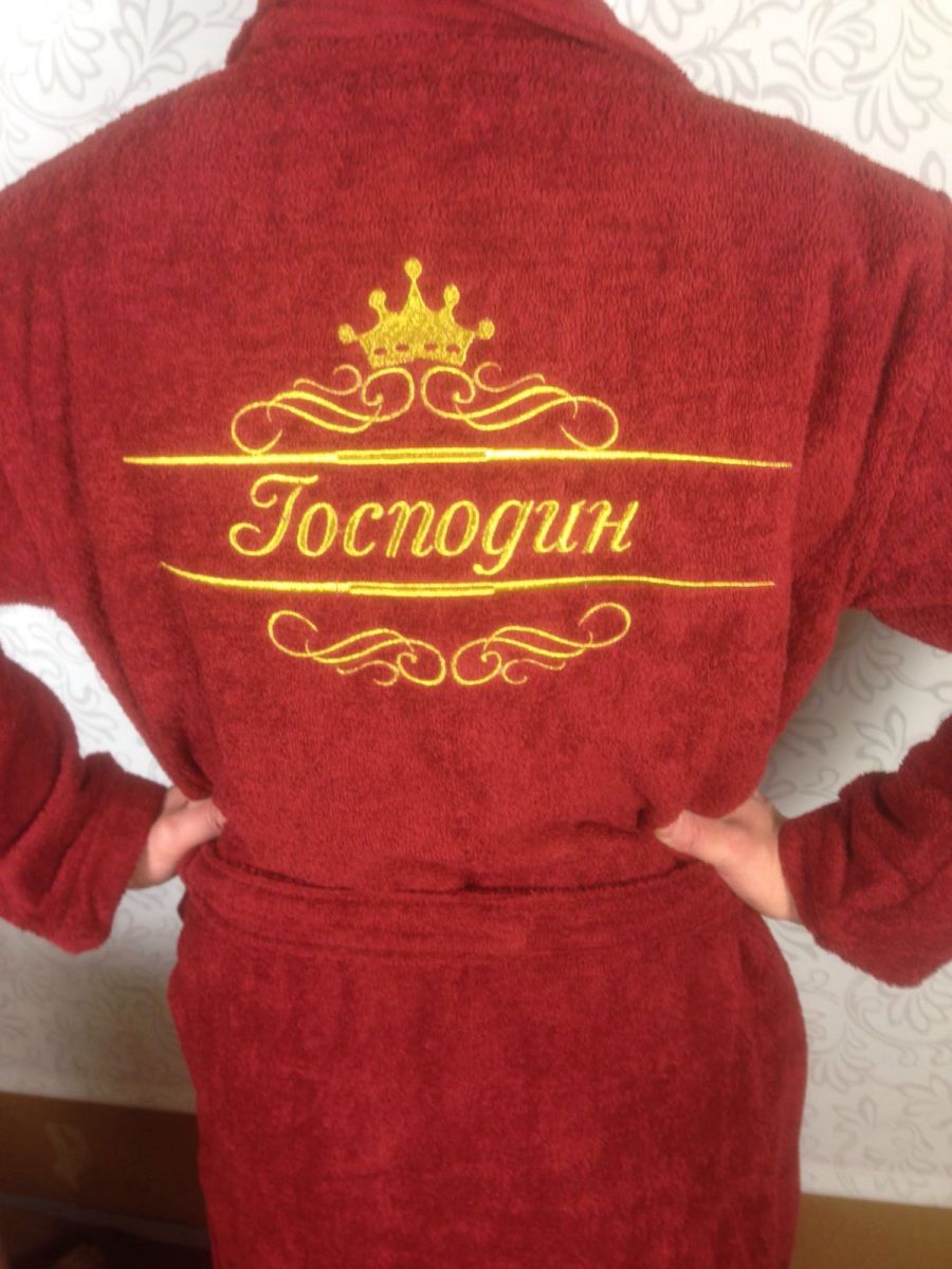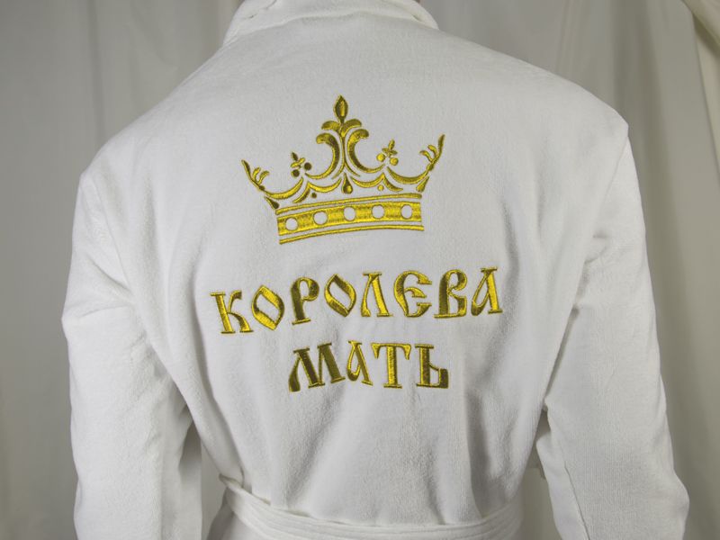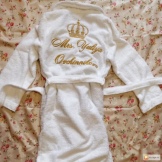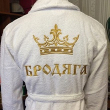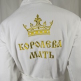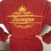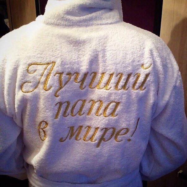 Bathrobe for mommy-heroine, while emphasizing the elegance and slimness of her figure. But the inscription on the back rather talks about the undoubted merits of the father of the family.The highlight of this robe is a shortened length, a comfortable belt and flattering embroidery, at the sight of which a man spreads his shoulders wider, feeling like a real getter and head of the clan.