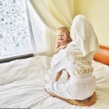 A great option for a family set of personal bathrobes. Children's dressing gown is different from the parent by the presence of a comfortable hood. In such a dress, all households, even now, can become candidates for the beach version of the competition “Mom, Dad, I am a sports family” or simply and effectively pose for a thematic photo shoot.