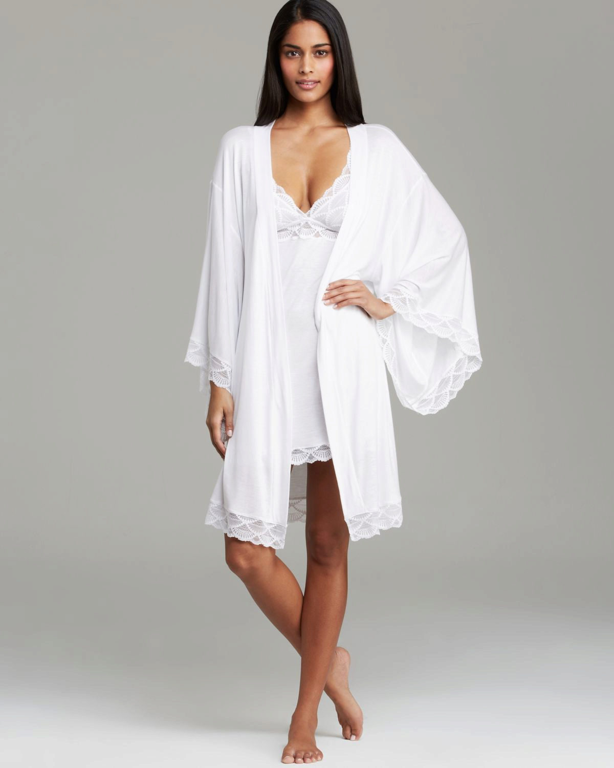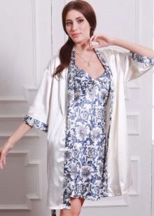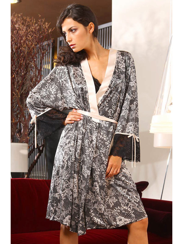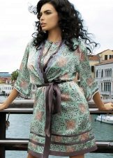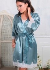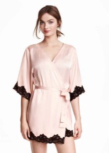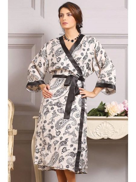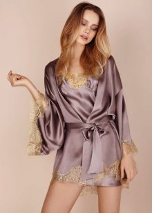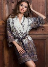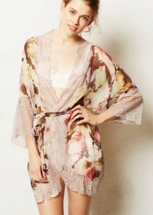 Another medium-sized robe-kimono with a calm “home” print, lace lace inserts on the sleeves, giving the image a whole romance and elegance.