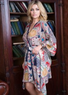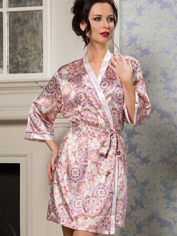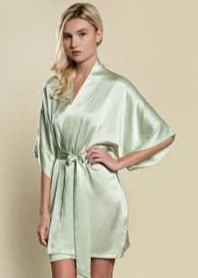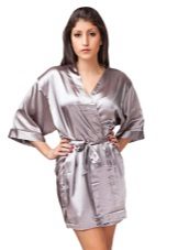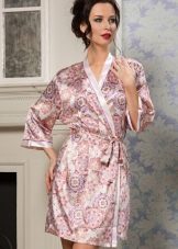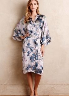The first image is remarkable in that this dressing gown has an average length and light calm coloring. It is made in the style of Japanese kimono, repeating its cut: a robe with a smell that keeps on the figure thanks to the belt, a V-shaped neckline, slightly flared sleeves ¾. This model is suitable for a relaxing evening getaway with family, but it will not seem to be strictly home-made clothing in case of a sudden appearance of guests.