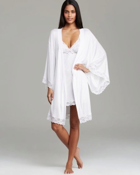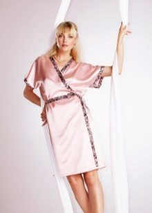 Modern designers with great enthusiasm attach to different models of lace and other textile decorations (satin ribbons, embroidery). It should be remembered that this type of dressing gown does not accept any fasteners such as buttons, hooks or buttons.