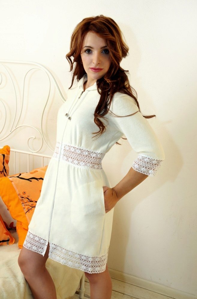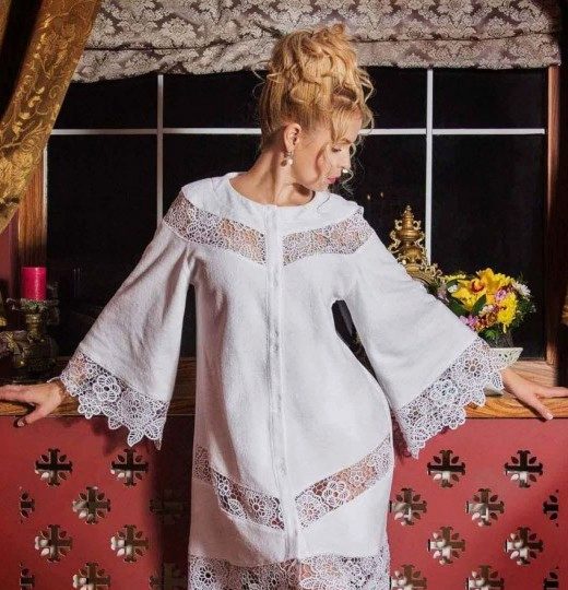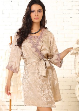 - Knitwear is a comfortable practical fabric, but this is no less popular among women. Bathrobes are also sewn from it, adding lace as inserts. Openwork material gives the product originality and chic.
