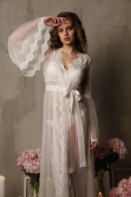 White color creates an innocent clean image. The robe is made of dense opaque lace, which ideally performs the function of inflaming passion and interest.