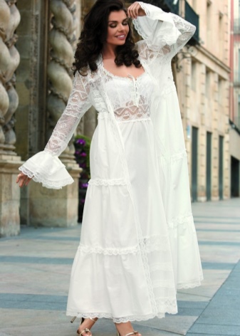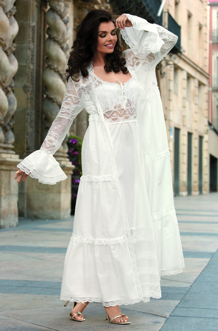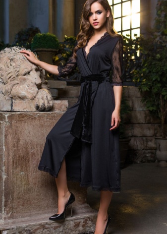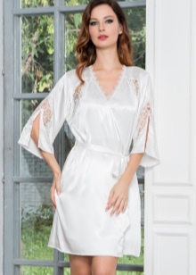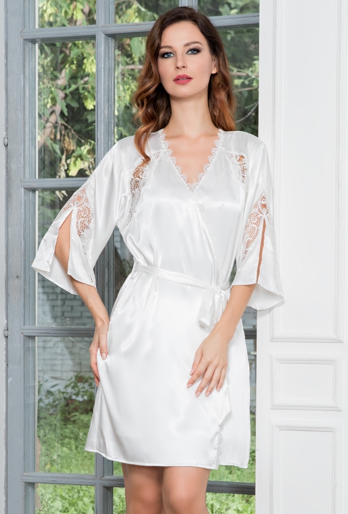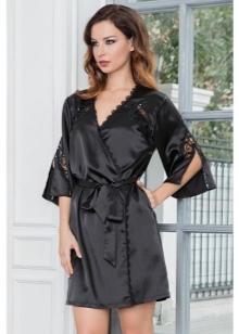 Bathrobe-kimono from 100% polyester is presented in two colors - black and white, decorated with lace and pockets.