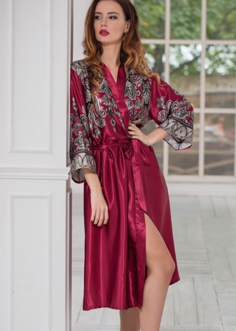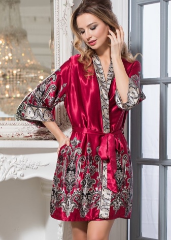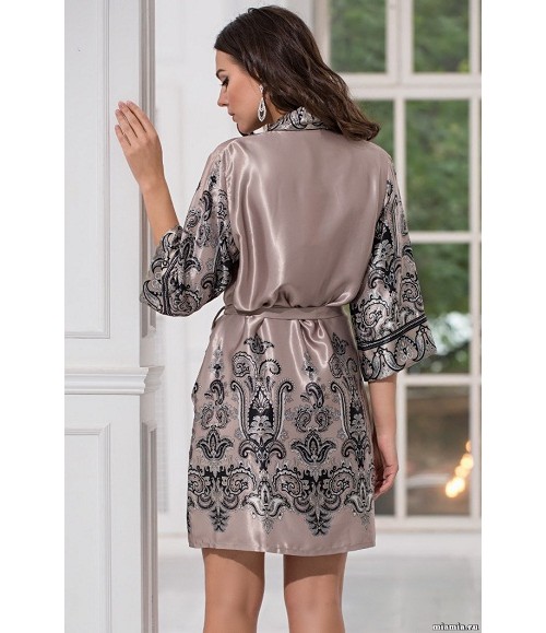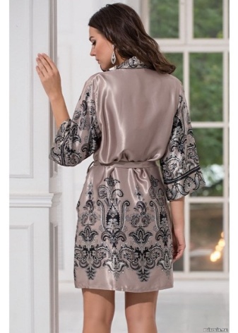 This luxurious robe-kimono adorns the coupon print, which is located on the shelf, back and sleeves. Bathrobe is made of natural silk, polyester and elastane.