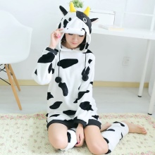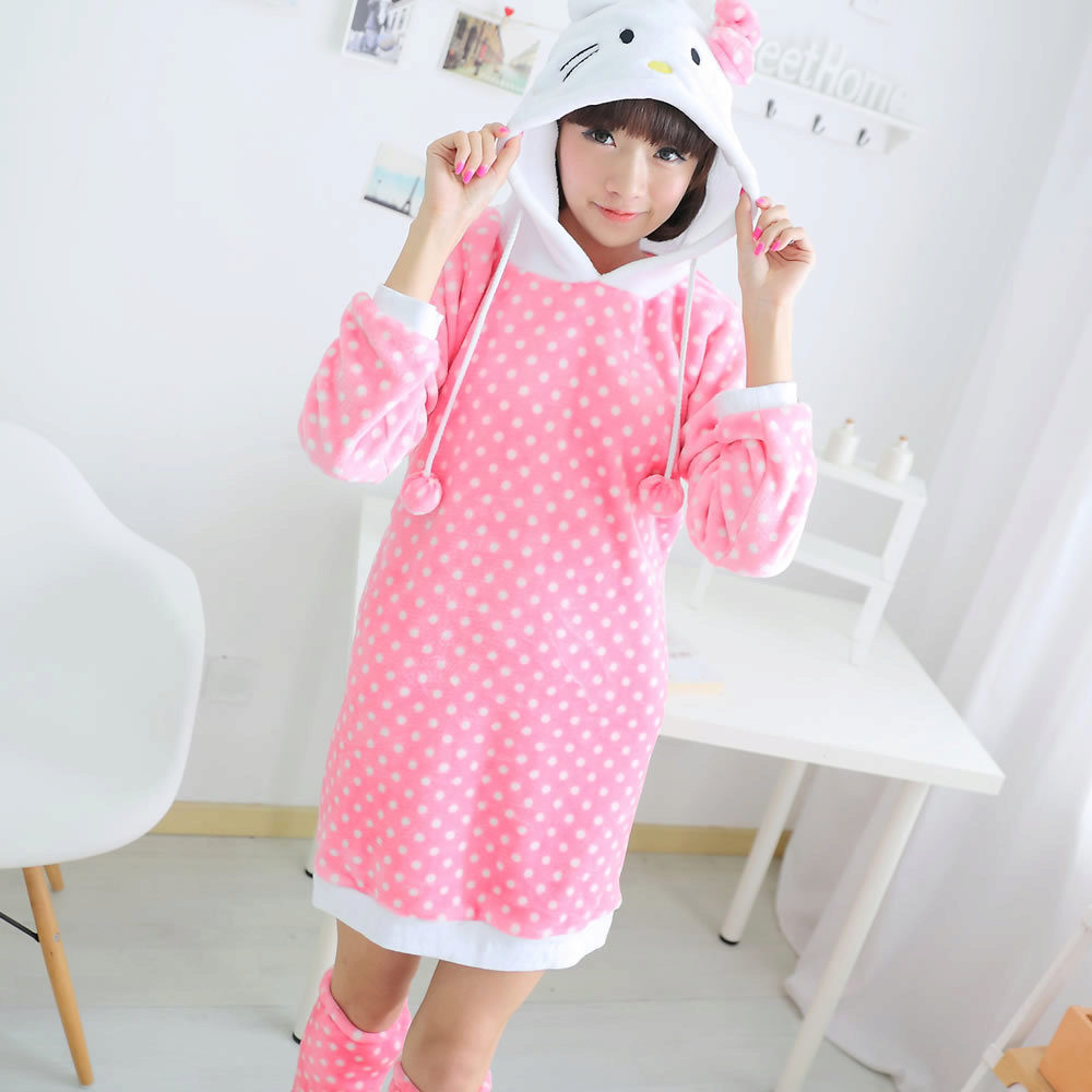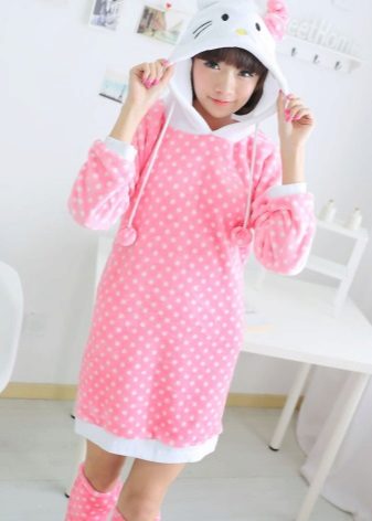 The charming female dressing gown is made in a beautiful pale pink shade and is decorated with gray edging. A bright colorful appliqué with a cartoon hero and funny ears on the hood are used as decor.