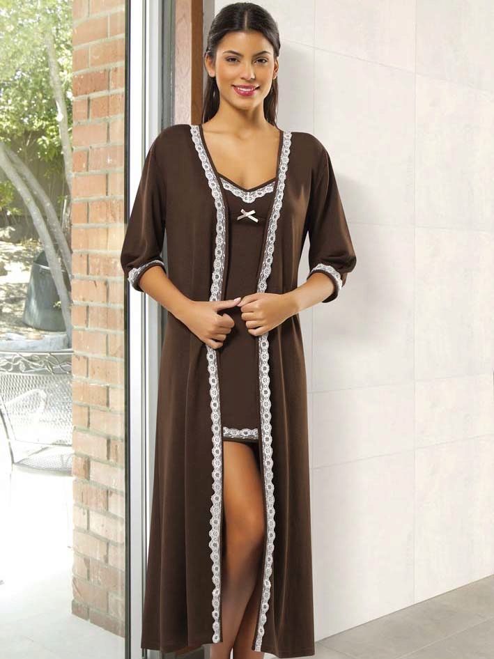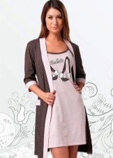 The stylish set consists of a short shirt with a deep V-neck and a light robe, trimmed in tone of the shirt. The set is made in white and several shades of brown, decorated with a beautiful pattern. A great option for everyday life.