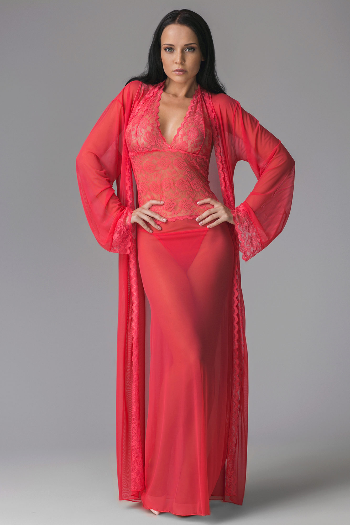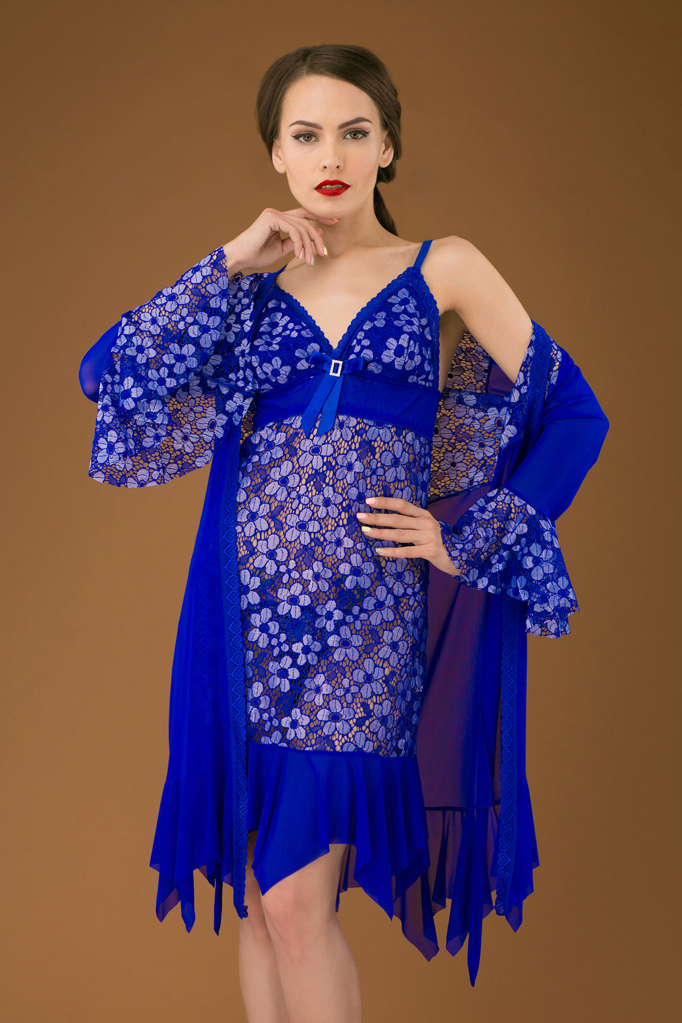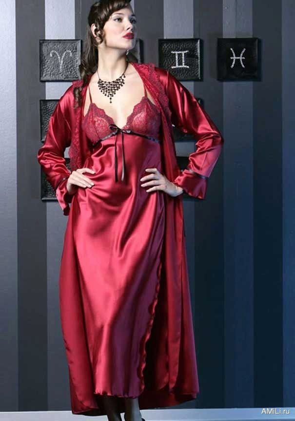 Long sets look very elegant and feminine. Especially elegant look such headsets made of beautiful flowing materials: silk, satin, chiffon, etc. Long shirts are often complemented by high side slits. The mini-shirt and the shortened dressing gown look not less cute and attractive than the long models.