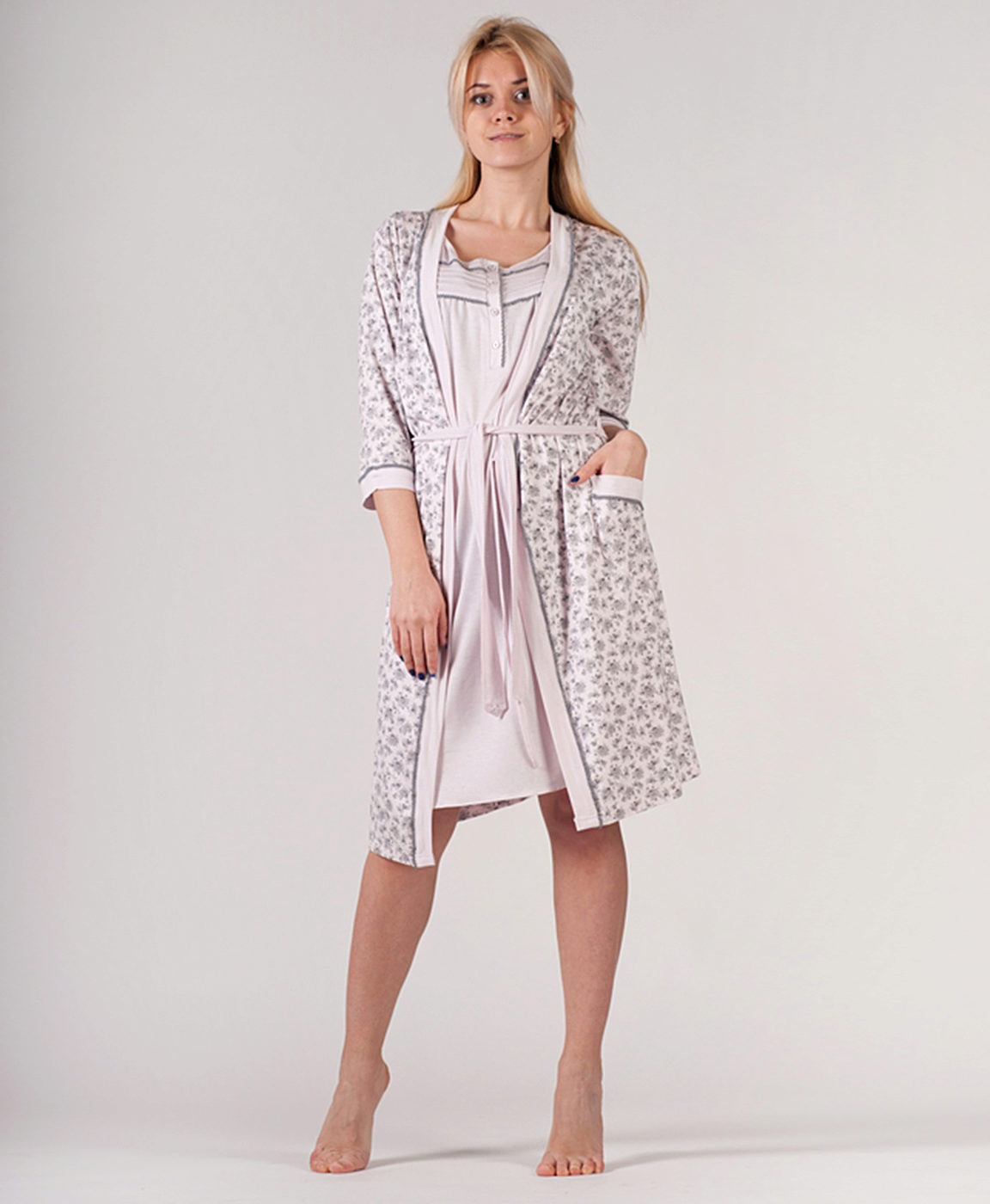 The set is made in a trendy combination of pink and gray colors this season, perfect for a pregnant woman. The shirt on the straps is decorated with frills on the neck and hem. The dressing gown is complemented by two deep pockets.