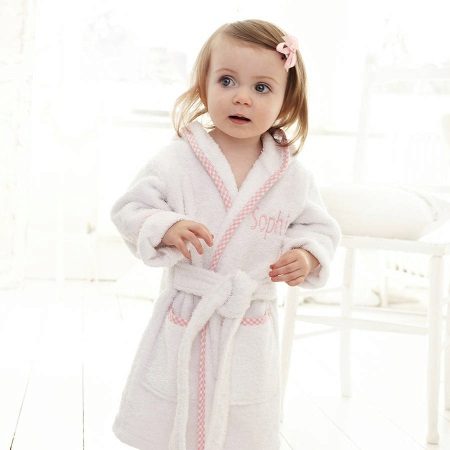 - Fluffy nominal dressing gown is perfect for wrapping your baby in it after bath procedures. In a fluffy terry product she will be very warm and comfortable.The combination of white color with pale pink trim is suitable for a real princess.