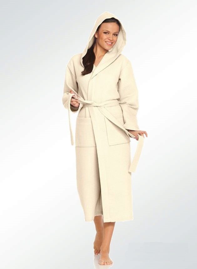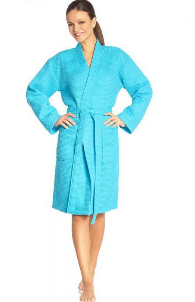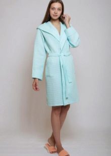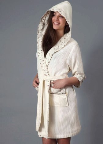 Waffle robes do not have any canonical style: now both long and short models are on the market, both with full sleeves and in 3/4 variation. Also, the choice of the future owner is left to decide whether the robe should be fitted with a hood or a comfortable collar will suffice. In case the item is selected to be worn after a bath, sauna, shower or bath, it would be logical to look after yourself with a hood with a hood, so that the wet hair is also warm, as is the whole body. In addition, being shrouded in a waffle fabric hood, hair will dry much faster.