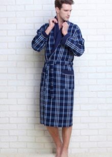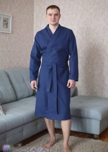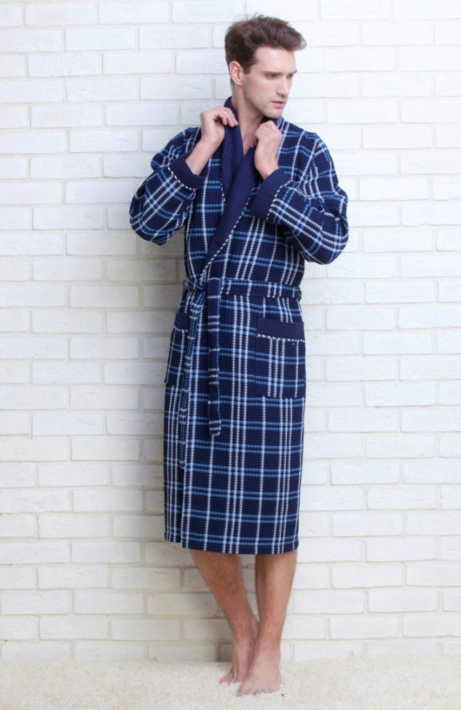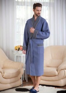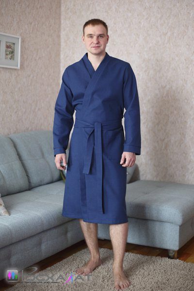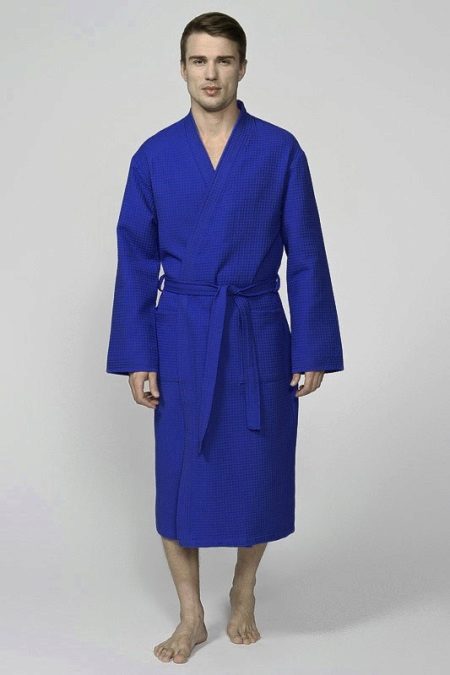 The laconic dressing gown in a large waffle cage, tailored in the style of traditional Japanese kimono, significantly benefits from the chosen color scheme. The rich blue gamma contrasts effectively with the skin, and comfortable “ears” for threading the belts in them save the wearer of such a kimono robe from having to look for this belt left somewhere when undressing.
