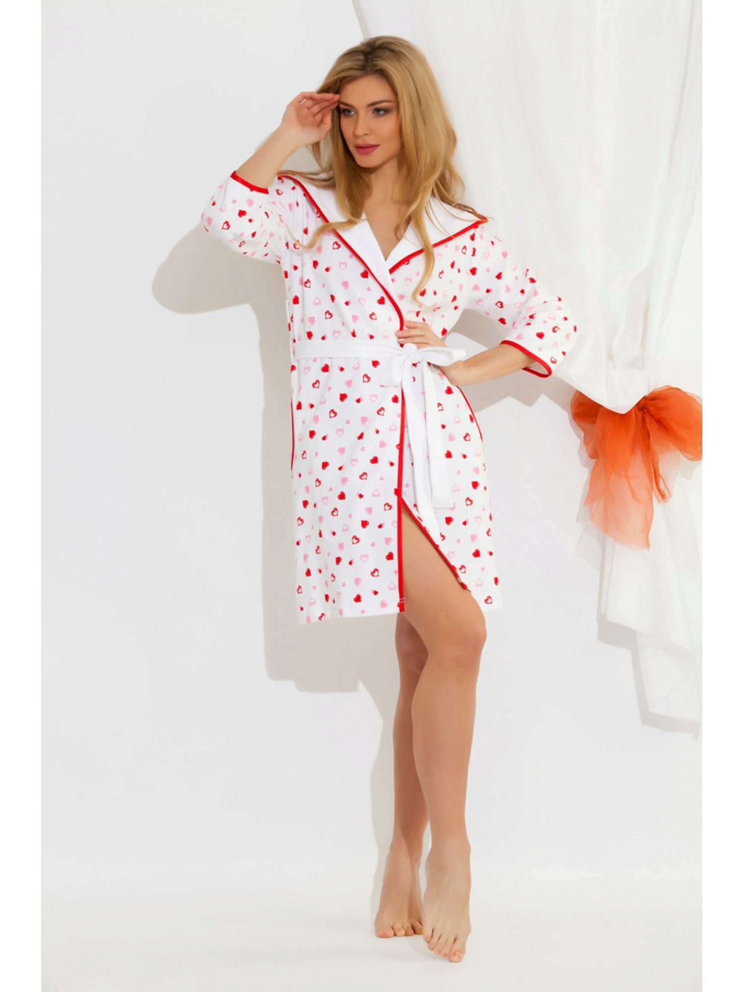 A shorter, seductive model made from white waffle fabric favorably emphasizes the tan, and the hood, worn over the head, makes an elegant emphasis on gorgeous dark hair. Lace trim adds pastoral robe, once again focusing attention on the charge of natural sexuality.