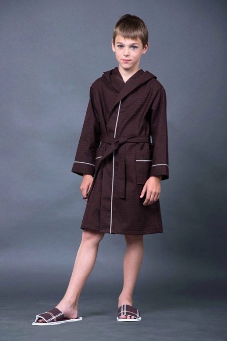 A bath waffle robe for a teenage boy is distinguished by narrow horizontal and vertical inserts of white material, visually highlighting the child’s excellent posture. A rich dark brown color will also appeal to the carrier of the dressing gown, and his mother - a practical and non-marking model will serve until the son grows out of it.