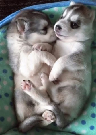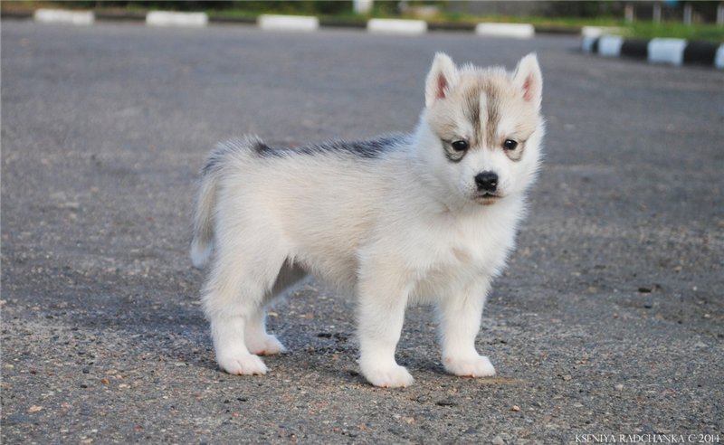 At birth, husky puppies are born blind and awkward. In a month they become already mobile and quick-witted babies. At this age, they may have different colors: from beige to gray. Husky eyes are beautiful almond-shaped, can "mow" a little. The ears are triangular and directed upwards. The back is straight, the chest is not wide. The tail is pointing down. The lips are black or brown, tightly closed.