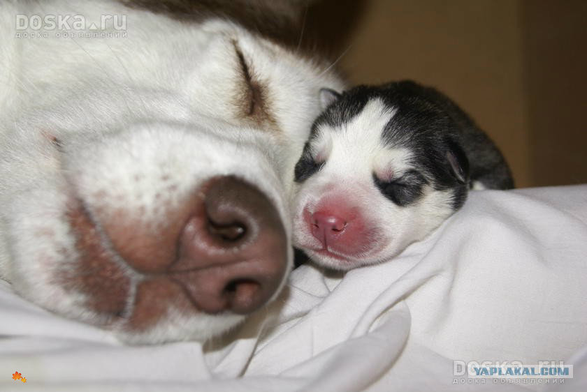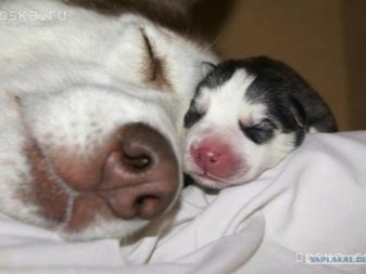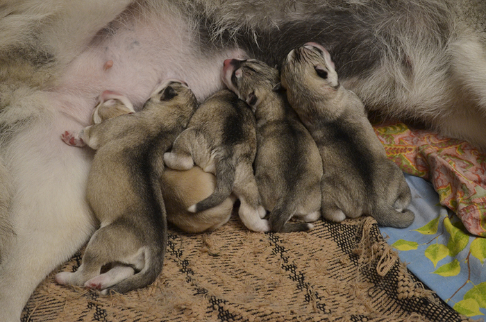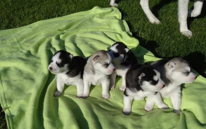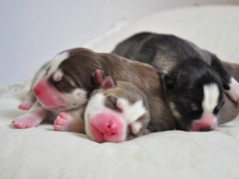 At birth, little huskies already have a number of necessary reflexes, and mothers, in turn, have a strong maternal instinct. If the birth is not the first, then the bitch herself will carefully take care of the babies, and you just need to help her a little. Moms calmly feed and lick puppies, protect from dangers. Blind and clumsy babies perfectly find mother nipples.