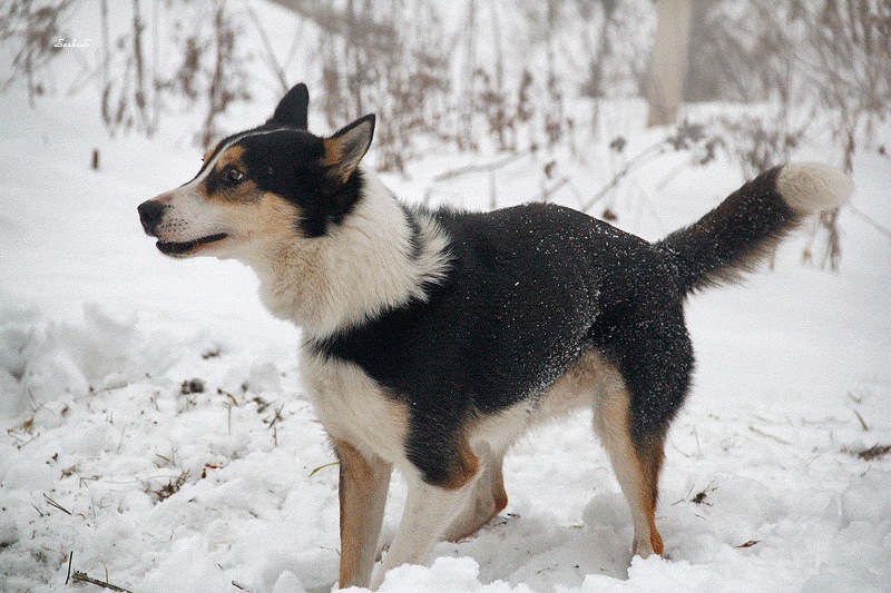 The muzzle is painted in pure white or much lighter tone than the rest of the coat, which distinguishes the dog from the wolf.