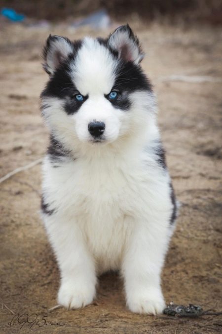 - The puppy looks very elegant in its black and white coat. But blue eyes look strictly and efficiently.