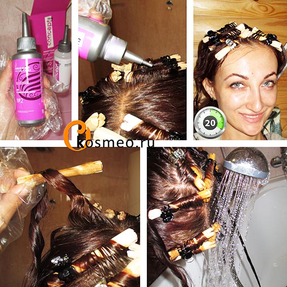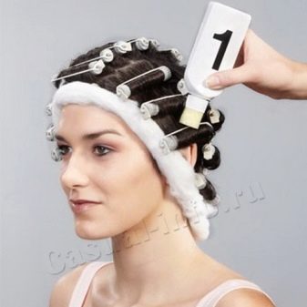 The resulting curls should certainly be fixed. Fixer solution is diluted in another container, after which, without removing the papillotok, the head is thoroughly washed from the main active solution. After that, using half of the fixing composition, process all twisted strands, incubate for about 10 minutes, unwind and apply the second part of the fixture, incubate for another 5 minutes and wash off finally.