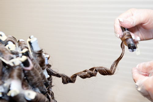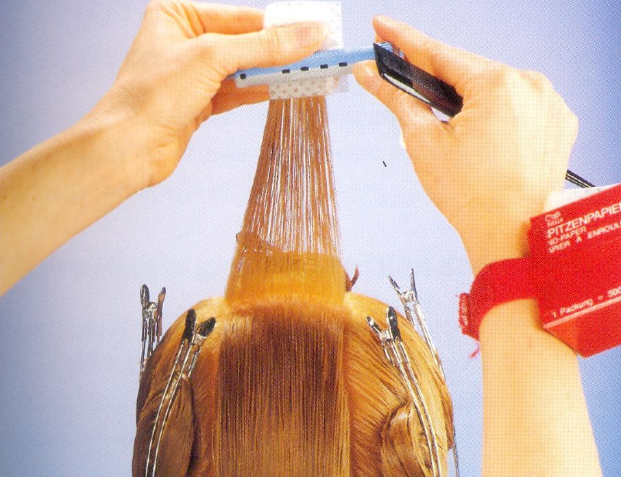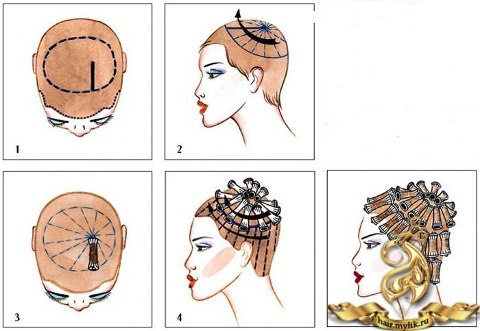 Before carrying out a chemical perming, the hair is moistened, avoiding massaging the skin, after which the mound is visually divided into two temporal, occipital and crown regions, each divided into several strands and wound parallel to the direction of hair growth. To protect the tips from aggressive components, it makes sense to wrap them with paper, and only then twist them on the bobbin.