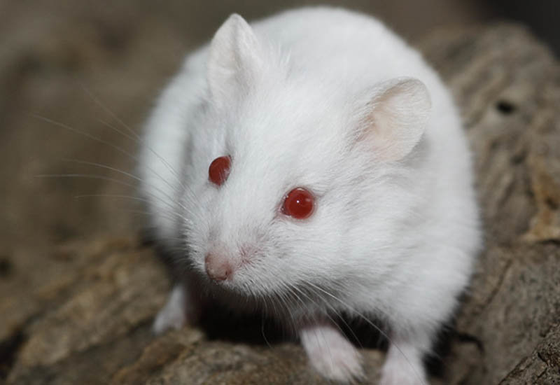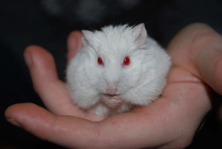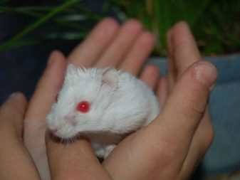 Wildlife is not very suitable for snow white hamster - albino is vulnerable to predators. For breeders and breeders such a feature is of great interest. The albino wool and skin is devoid of coloring pigments. Because of the mutation, the eyes color of the animals is red: through a transparent iris (there is no melanin in it) a network of blood vessels is visible.
