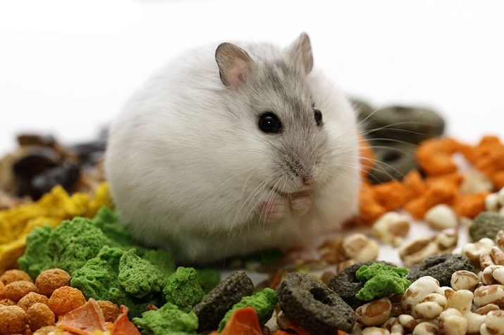 An albino owner should not worry too much about his diet: the white hamster will eat the same as his relatives. Ready-made feeds based on wheat, oats and other grains, as well as sunflower seeds and pumpkin, corn, nuts, dried and fresh vegetables and fruits (carrots, beets, pears, raspberries, strawberries, peas, zucchini, apples) will work well. We should not forget about protein foods - an albino will enjoy eating boiled (but not fried) chicken and fish, eggs and shrimps.