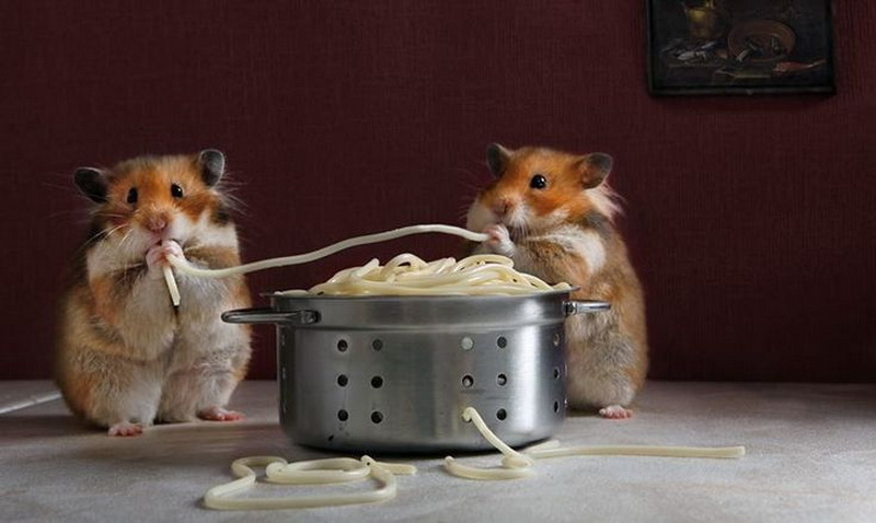 As evidenced by the reviews of individual breeders, their fluffies often take part in "family dinners" - they consume the same thing as their owners. It is quite interesting to watch how the rodent “looks narrowly” at the large dish, but still such feeding is not necessary - human food is often too heavy for hamsters, therefore it is permissible only in small doses.