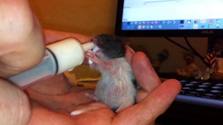 Special attention is given to the nutrition of little homyachats In the overwhelming majority of cases, their feeding lies on the female, and even self-feeding the cubs, which are necessary for her cubs, she herself delivers to the equipped nest. But there are situations when the mother dies or, for some reason, shows aggression towards the children and refuses to feed them. In such a situation, the care of the kids lies entirely with the breeders.