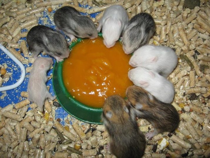When a newborn is 2 weeks old, the menu can be supplemented with wiped porridge cooked in plain water without sugar and oil; on the third week, you can add vegetable or meat puree to the menu (any suitable for feeding children can do, for example, Subject or Agusha) ). Closer to the month, you can add frayed cottage cheese, boiled egg yolk and pumpkin. During this period, you can gradually transfer the hamsters to adult food, but up to one and a half months the mixture should remain the main feed.