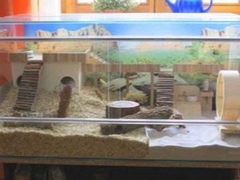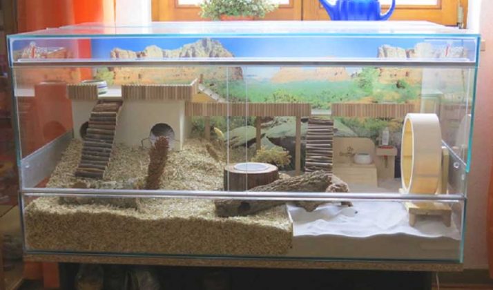 - Terrariums and aquariums are designed for dwarf and other small hamsters. Structures must have a volume of at least 40 liters. The top of such a dwelling should be open to the air or covered with a grill to prevent the curious animal from getting out of it. For better aeration, the height of the aquarium should be less than its width, then the glass walls will not sweat and will not create favorable conditions for the emergence and reproduction of harmful microorganisms. Aquariums provide complete safety to their residents from other pets, and the space around them will always be clean.