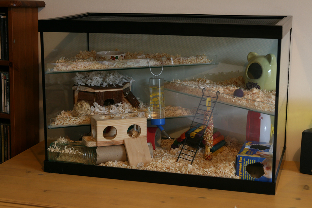 - Glass. These are usually terrariums and aquariums. Although not intended for hamsters, they are often used for them.Walls in glass dwellings can be made not only from pure glass, but also from plexiglass. It is quite durable material, although it requires caution when handling and washing. The disadvantage of such houses for hamsters is their large mass and not quite satisfactory ventilation capacity. In addition, it is not very convenient to fix attributes on the glass walls.