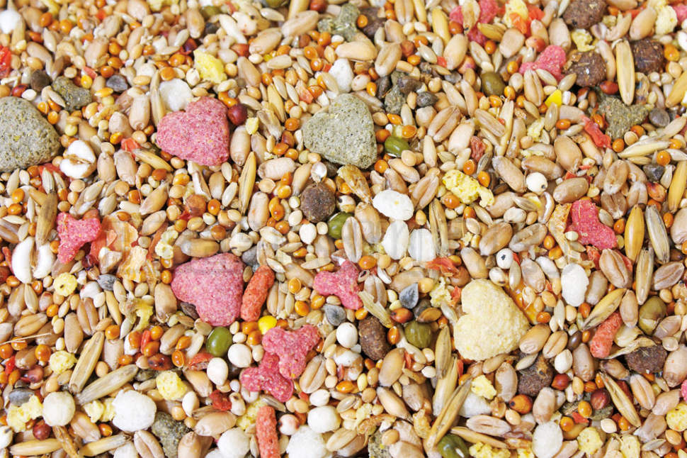 The most affordable feed. This feed is varied in composition. Its main components are different types of cereals, nuts and sunflower seeds. This feed is characterized by convenient packaging, which is divided into two compartments, which protects it from exposure to sunlight and ingress of excess moisture. The advantages include: good composition, low price and low product consumption. By cons, there is a small amount of protein and the presence of dyes.