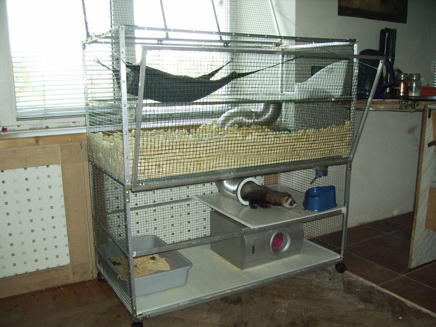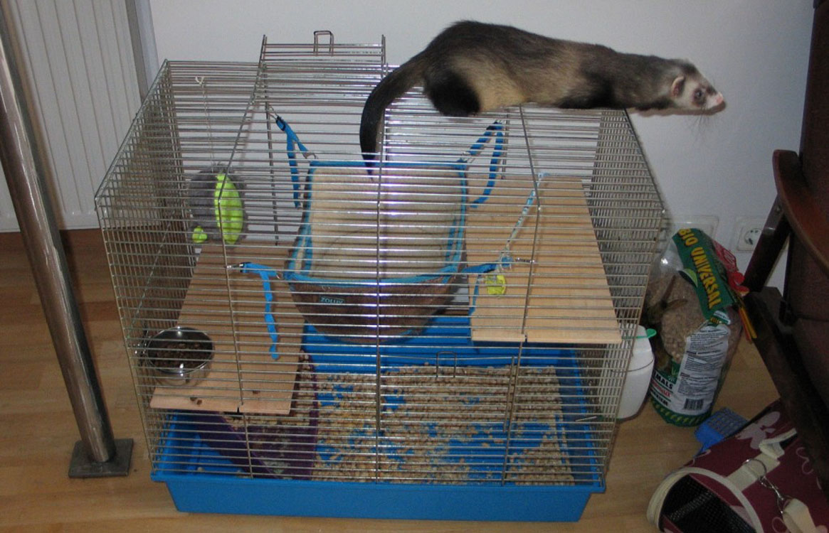 The ferret sleeps 13-15 hours a day, most often during the day. This means that at night all family members will sleep peacefully, and their pet will put maximum effort to prevent this, wake up their owners and involve them in active games. In order not to give him the opportunity to turn his house upside down, the animal will need a good spacious cage, best of all an open-air cage, the minimum dimensions of which should correspond to 1x1x0.7 m.